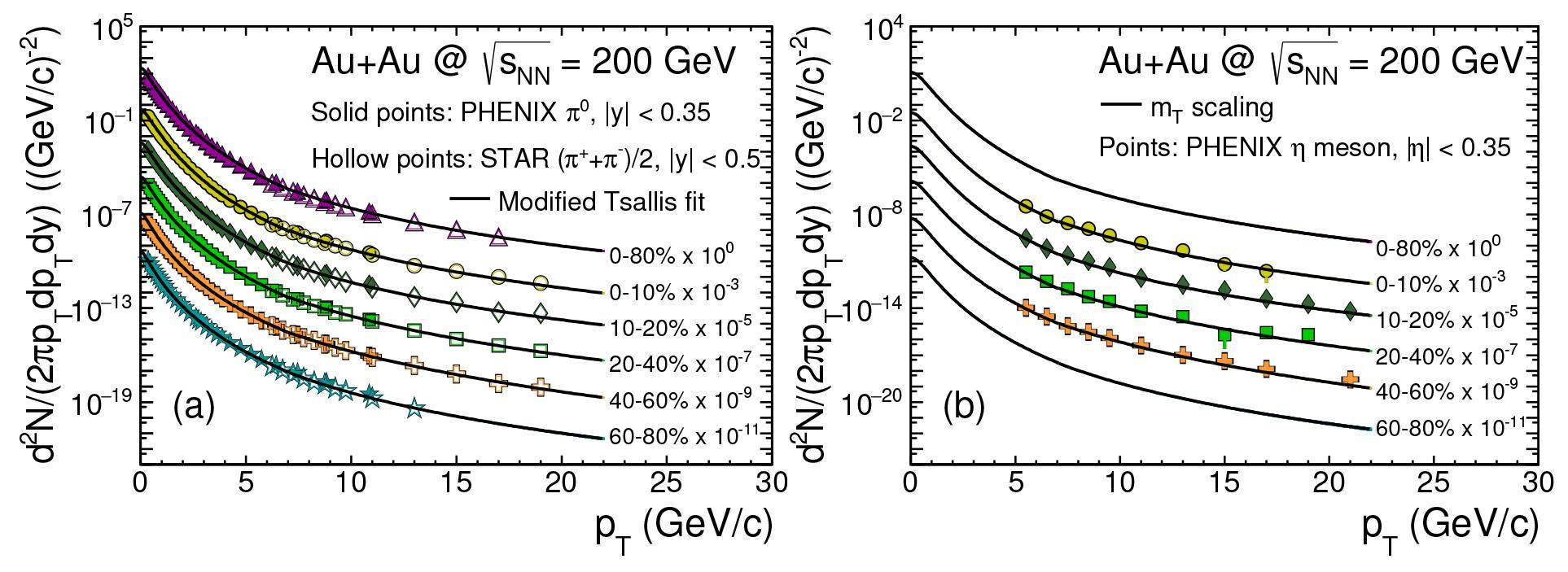 The invariant yields of π0 as a function of pT, inferred from the STAR measurement ((π++π-)/2, |y| < 0.5) [37] and directly measured through the PHENIX experiment (|y| < 0.35) [38, 39], are shown in Fig. 2 (a) for Au + Au collisions of different centrality classes. Good agreements are seen among the different measurements in the overlapping kinematic range. Because of in-medium modifications of these yields compared to those in p + p collisions [40], the modified Tsallis function is used to fit the pT spectra: