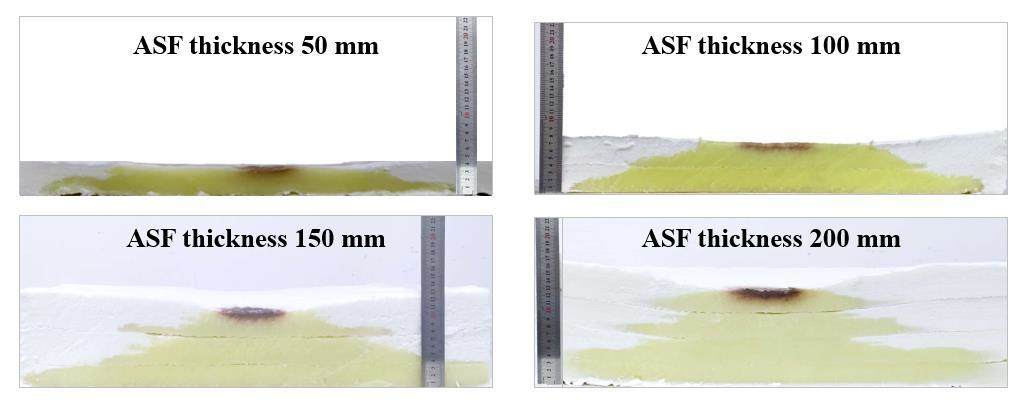 The behavior of penetration and diffusion for LMS flowing through the ASF was further investigated by inspecting the vertical section of the ASF with different thicknesses (50, 100, 150, and 200 mm) at a comparable LMS flow rate of ~20 kg/h, as shown in Fig. 6. It is clear that all the penetration and diffusion trends were similar, and all outlines of the LMS permeation area were approximately the same. For all thicknesses of ASF, molten salt penetrates through the ASF and continues to ooze into the catch tray.