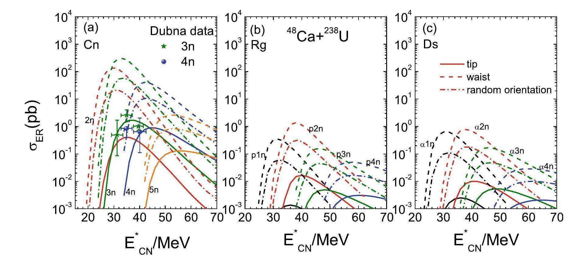 Superheavy elements from Fl (Z=114) to Og (Z=118) were successfully synthesized with 48 Ca-induced reactions on actinide targets. This manifests a strong shell effect in the production and decay chains. Figure 4 shows the ER excitation functions for producing superheavy elements 114-118 with 244Pu, 248Cm, 249Bk, and 249Cf as the targets. Different evaporation channels are distinguished by colored lines and compared with experimental data [55, 58]. The 3n and 4n channels are the dominant decay modes for SHN production. The 2n channel is pronounced with an increase in the charge number of the SHN. However, the cross sections in the 4n and 5n channels decrease with increasing SHN. Unlike the cold fusion reactions, the maximal cross section in the 48Ca induced reactions weakly depends on the mass of ER nucleus, e.g., the value of 8 pb for 288Fl and 0.6 pb for 294Og. The construction of the target material for the synthesis of new SHNs is a challenge. The hot fusion reactions also provide a possible way to create new elements in the eighth period with projectiles 45Sc, 50Ti, 54Cr, 58Fe, 64Ni, etc. In addition to the reaction dynamics in the formation of SHN in hot fusion reactions, nuclear structure effects, such as shell effect, neutron separation energy, odd-even effect, microscopic state of compound nucleus (isomeric state), etc., are important in the evaluation of the production cross section.