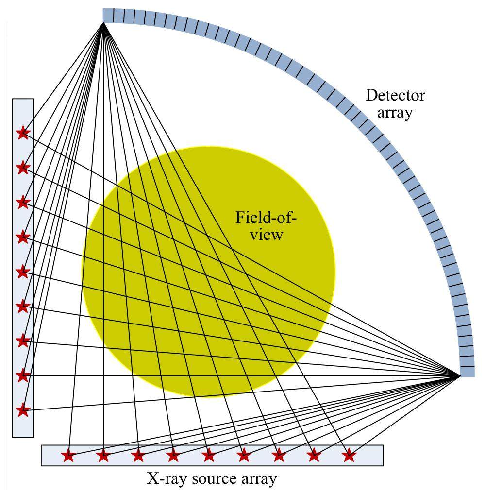Spiral computer tomography (spiral CT) [1-4] is currently the most common and state-of-the-art imaging application. However, spiral CT has several inherent defects. First, the X-ray source continuously spins at a high speed throughout the scanning process, resulting in large effective focal spots. Second, the X-ray source, high-voltage power, and cooling system on the slip ring slow down rotation. The fastest rotation of a commercial spiral CT is 4 Hz, which is not suitable for imaging a dynamic process or moving objects [5]. Stationary CT [6] replaces the slip ring of the spiral CT with an array of X-ray sources and controls the sources to operate in a set sequence to scan an object from different angles. The scanning process is shown in Fig. 1. The electronic switch replaces the mechanical rotation of the spiral CT. This part greatly improves the scan efficiency and eliminates the motion artifact. The stationary CT device features the following advantages.[7,8] Firstly, it increases the overall power of the source, and improves the contrast ratio. Secondly, it provides more imaging information. Thirdly, it can reduce the X-ray dose on the inspected object by optimizing the imaging system. Therefore, the stationary CT has great potential for industrial non-destructive inspection and medical CT imaging [9].