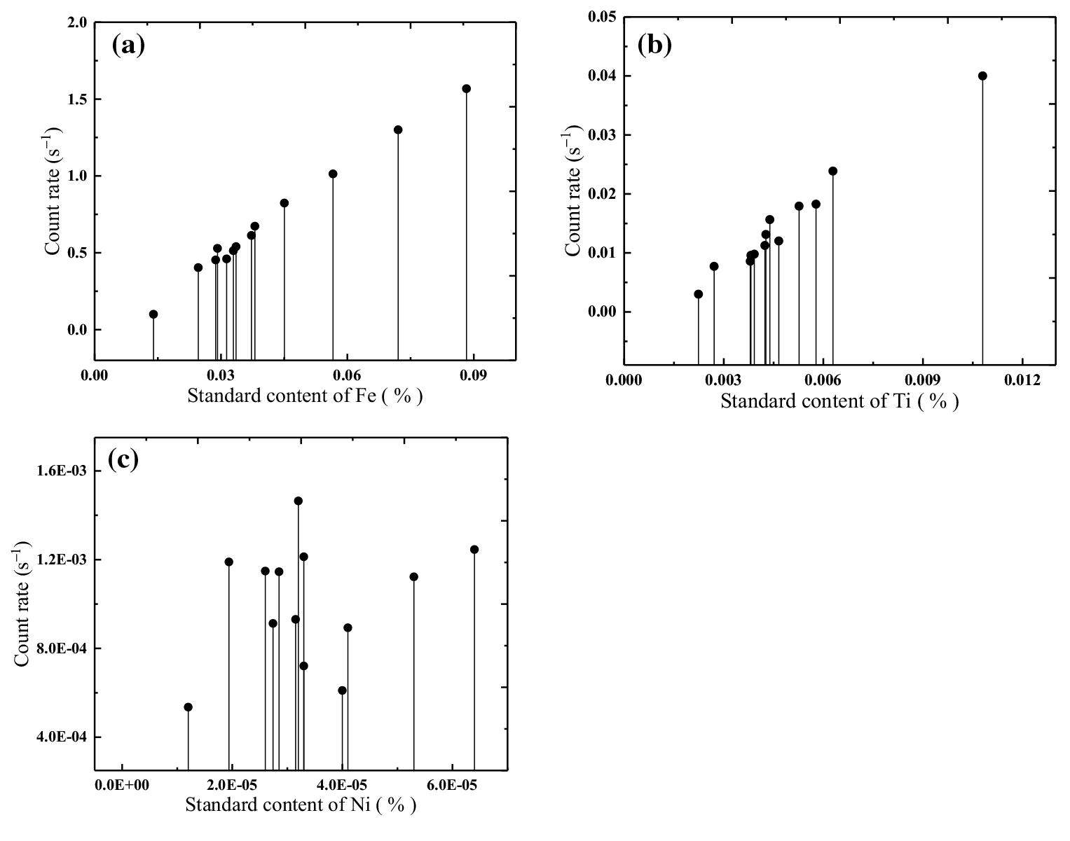 (1) For high-concentration elements, such as Fe (as shown in Fig. 8b), whose maximum standard content is 8.828%, the minimum relative error is 0.35% (Nss 5). However, the relative error increases with the decrease of its standard content. When the standard content is 2.462%, the relative error reaches 18.64% (Nss 2), which is acceptable in EDXRF analyses. This is mainly because Fe is the major element in the solid samples; its concentration exceeds 1.39%. The background scattering intensity of the original X-ray beam can be considered inversely proportional to the element contents. Therefore, comparatively low backscattered radiation contributes little to the characteristic peak area of Fe during the background-deducing step. In addition, the count rate of the detector is proportional to the content of Fe, as shown in Fig. 9a. Increasing the count rate would effectively reduce the statistical error. The calculation results of Ti, which is also a major element in the Nss samples, are similar to those of Fe. The differences between the red columns and the shadow columns for Ti in Fig. 8a exist for the same reason as for Fe.