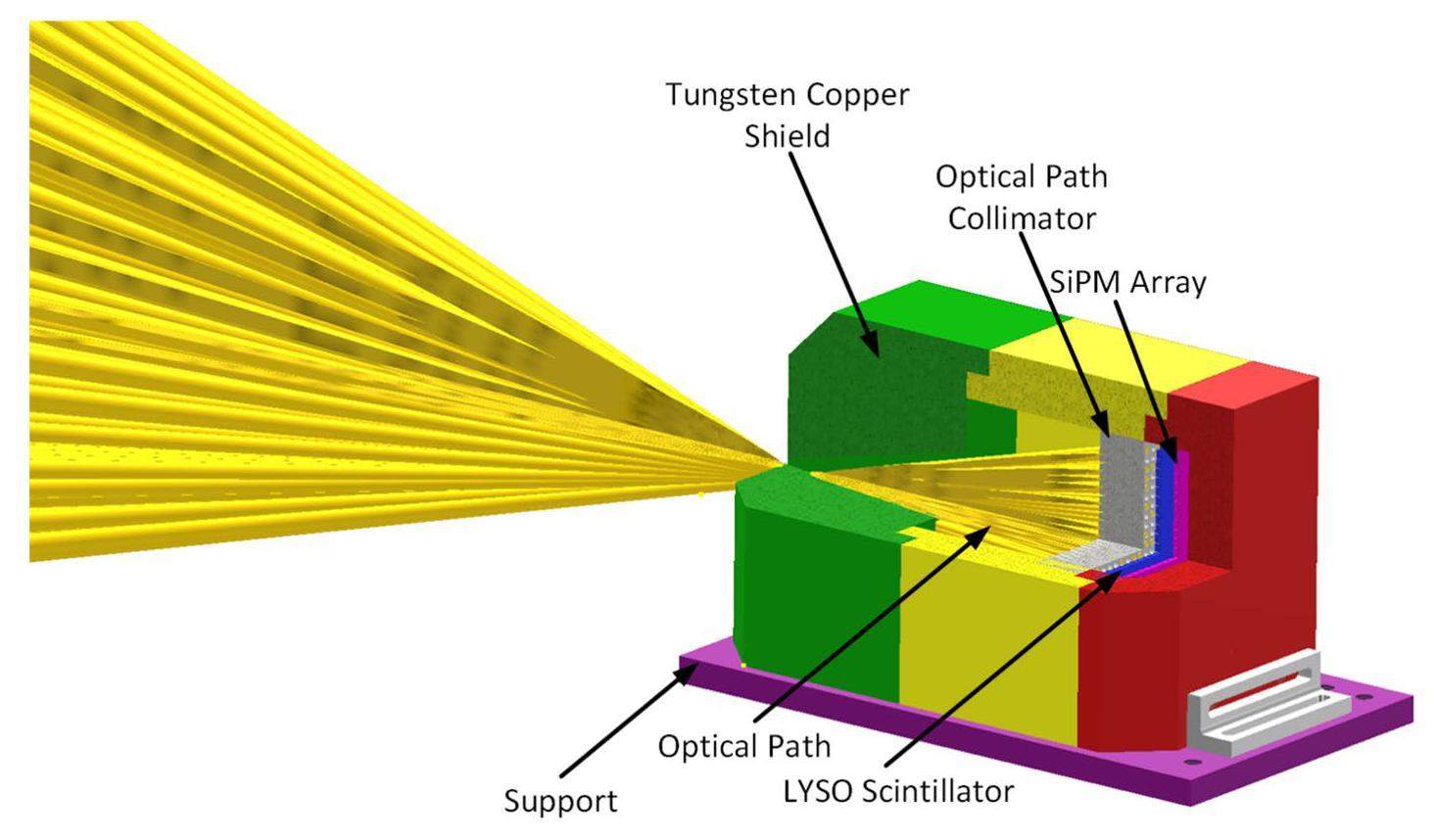 The tangentially viewed HXR-imaging system primarily comprises an LYSO scintillator crystal, a SiPM detector array, and online spectra-processing electronics [38]. The system is located outside the vacuum chamber, and a 1-mm-thick beryllium window is used to protect the vacuum. This system can measure HXRs with energies ranging from 20 keV to 300 keV, with a spatial resolution of several centimeters, a temporal resolution of several tens of microseconds, and an energy resolution of approximately 8%@662 keV. The design of the HXR imaging system is illustrated in Fig. 2, where the LYSO scintillator and SiPM array are located inside the tungsten–copper shield; only photons passing through the small pinhole in front of the shield can enter the detector. When a LYSO crystal is struck by X-ray photons, certain wavelengths of visible or near-visible photons are scintillated. The visible light is detected by the SiPM arrays and converted into electrical-pulse signals, and an analog-to-digital converter then digitizes the electrical-pulse signals and delivers them to the FPGA module. The FPGA module rearranges these digitized signals into a specific format to identify the photon energy and deposition time. Finally, the experimental data containing time and pulse-amplitude information are transferred to a remote-controlled PC. The time evolution of the radiation intensity is obtained from the time evolution of the energy deposition on each detector. The spatial positions corresponding to different detectors can reflect the spatial evolution of the radiation intensity. The energy-spectrum information of a specific period can be used to deduce the temperature and distribution characteristics of fast electrons.