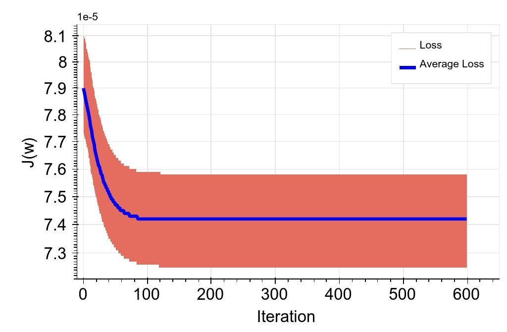 A dataset of 60,000 samples (50,000 simulated data and 10,000 real machine data) was divided into training and testing datasets. (70% and 30% respectively), with each sample pair consisting of 2 inputs (tune errors) and 32 outputs (quadrupole errors). We chose the length of the regularization path to be 0.0000001, the number of α values in the regularization path to be 600, and the number of cross-validations to be five each time when training the STM. The dataset was randomly partitioned into k-1 subsamples of equal size for this approach. While k-1 subsamples were used to develop a prediction, the remaining subsample was used to validate this model[17]. We obtained the best STM through model training and evaluation, with a regularization parameter of 1.458× 10-7 (see Figure 2) and a loss item mean squared error value of 7.419× 10-5 (see Figure 3).