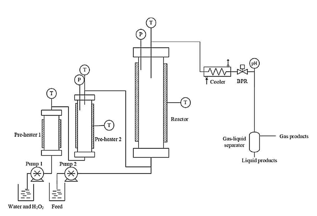 The SCWO-1000 system was constructed based on the SCWO-250 system used in previous studies [13, 27], as shown in Fig. 2. The reaction system mainly included one tank reactor (1000 mL, Inconel 625) and two preheaters (200 mL and 250 mL, Inconel 625). The maximum operating temperature and pressure of the equipment were 600℃ and 28.4 MPa, respectively. Considering that pressure had no significant effect on organic matter removal, all experiments were performed at 24 MPa. Before the start of each SCWO experiment, deionized water was pumped into two preheaters and one tank reactor, and the temperature was gradually increased using the PID meter (proportional integral derivative) meter. When the internal temperature exceeded 100℃, the pressure should be slowly increased to the expected value. Deionized water and a hydrogen peroxide solution were jointly pumped into the preheaters via a pressure metering pump (pump 1). Then, the feedstock solution (DURSET) was pumped directly into the tank reactor with the assistance of another pressure metering pump (pump 2). After the exothermic SCWO reaction, the outflowing reaction mixture was cooled to room temperature using a tubular cooling device. The condensed reaction mixture was adjusted to atmospheric pressure using a backpressure regulator (BPR). The mixture was sent to a gas-liquid separator, and the required liquid product sample was obtained after separation of the gas and liquid. The organic matter content in the liquid effluents was measured and evaluated using a HACH chemical oxygen demand digestion reactor and colorimeter.