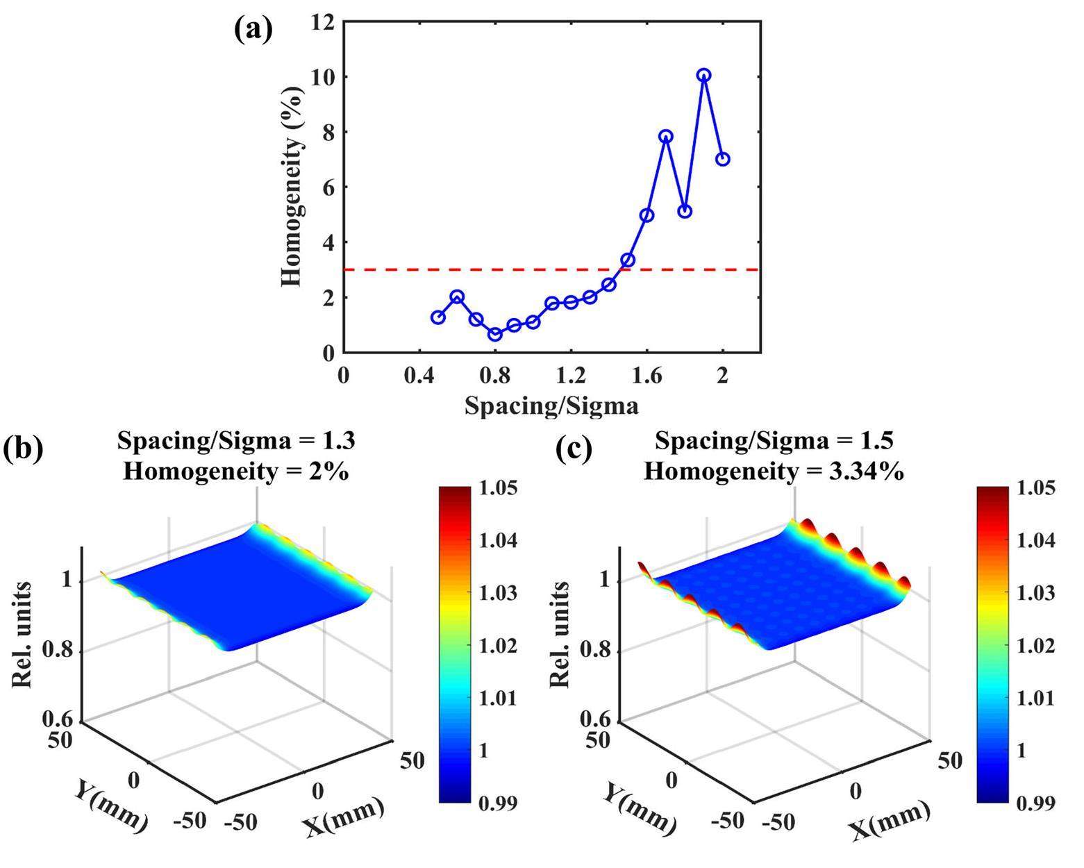 The homogeneity of the superposition distribution was employed to estimate the effectiveness of the compensation method. For the extreme raster scanning scenario, the homogeneity of the superposition distribution under various conditions was quantitatively calculated as